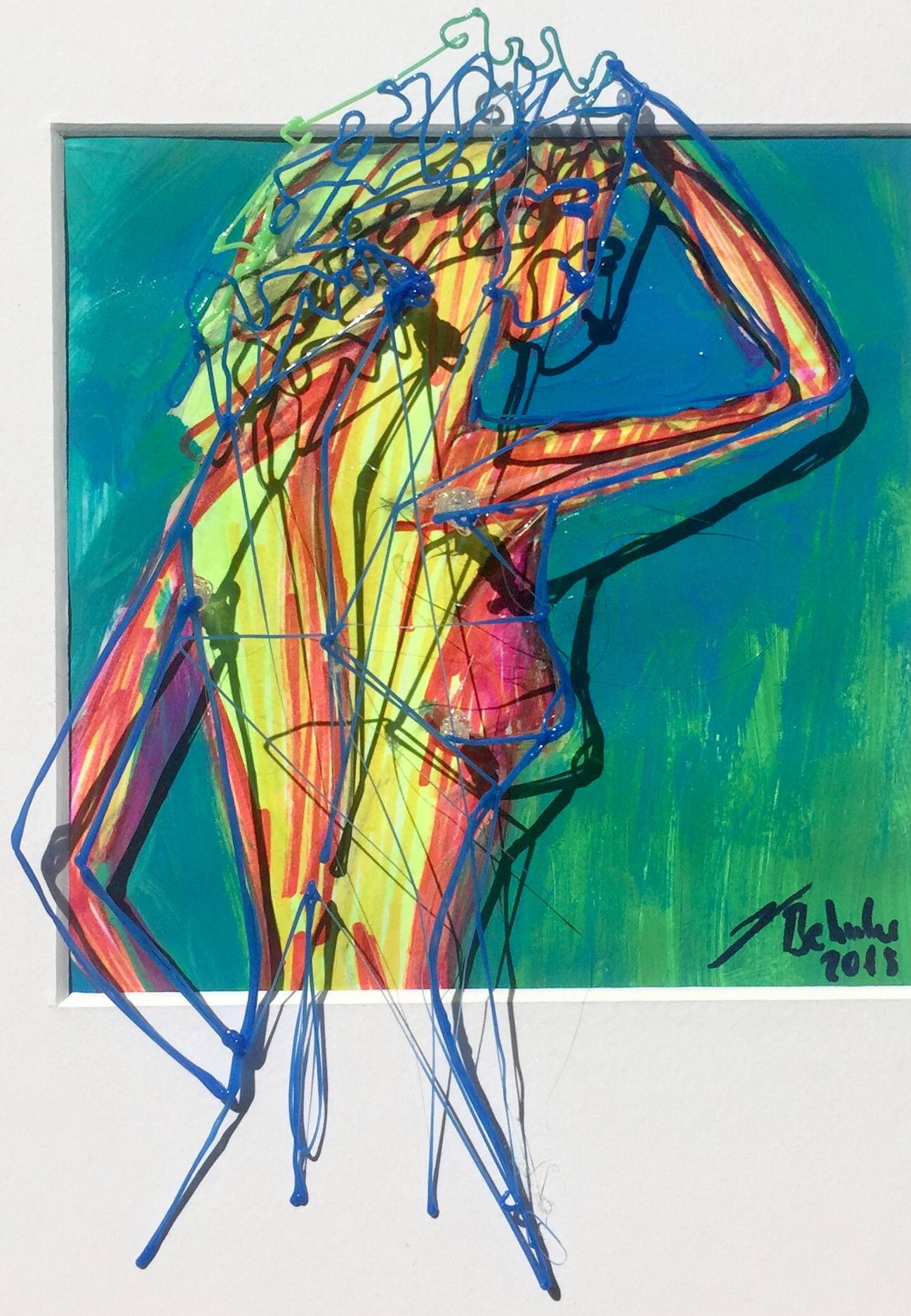 3D Stift auf Papier. Eine Frau mit starkem Blick abstrakt in Szene gesetzt. Blaue Farbnuancen kombiniert mit blauer 3D Kunst runden das Kunstwerk ab.