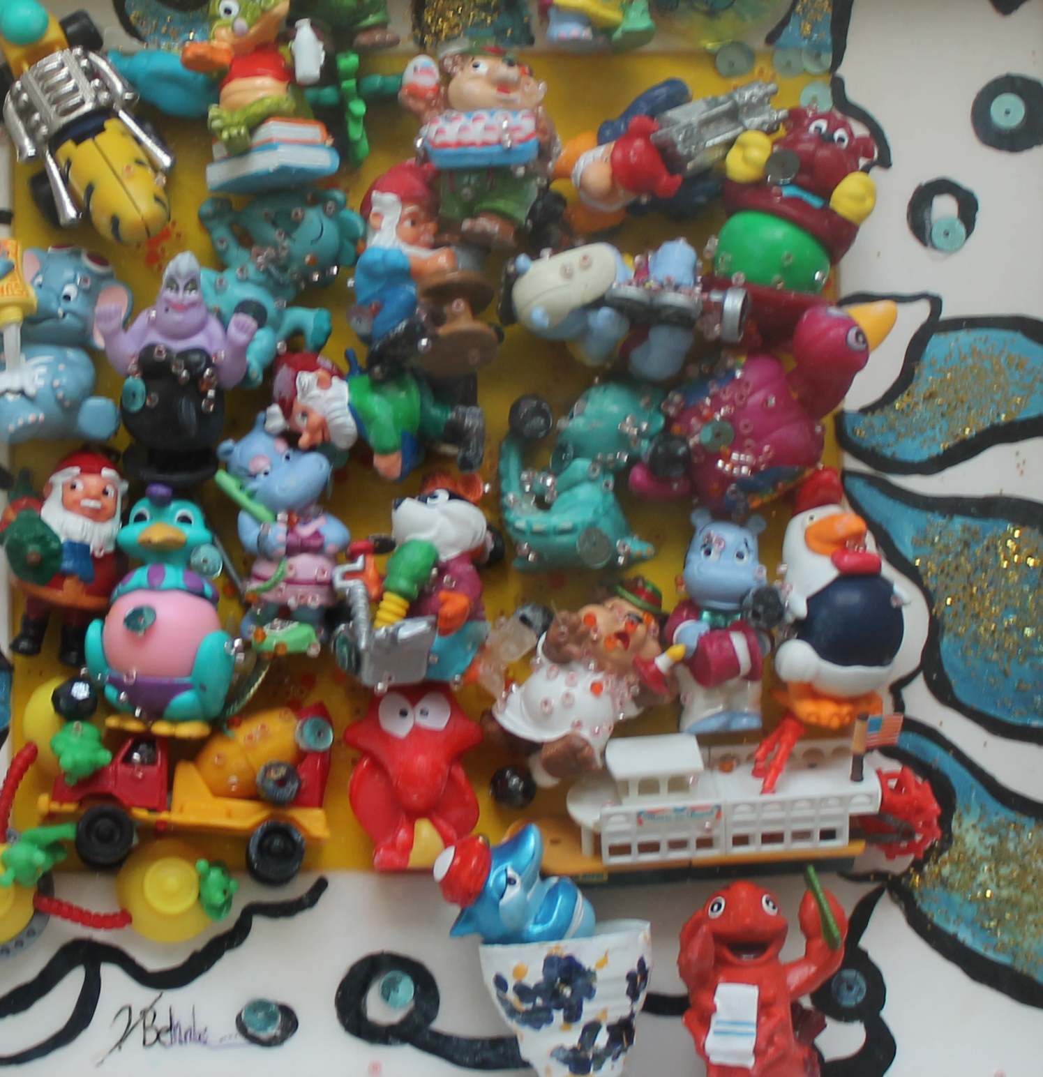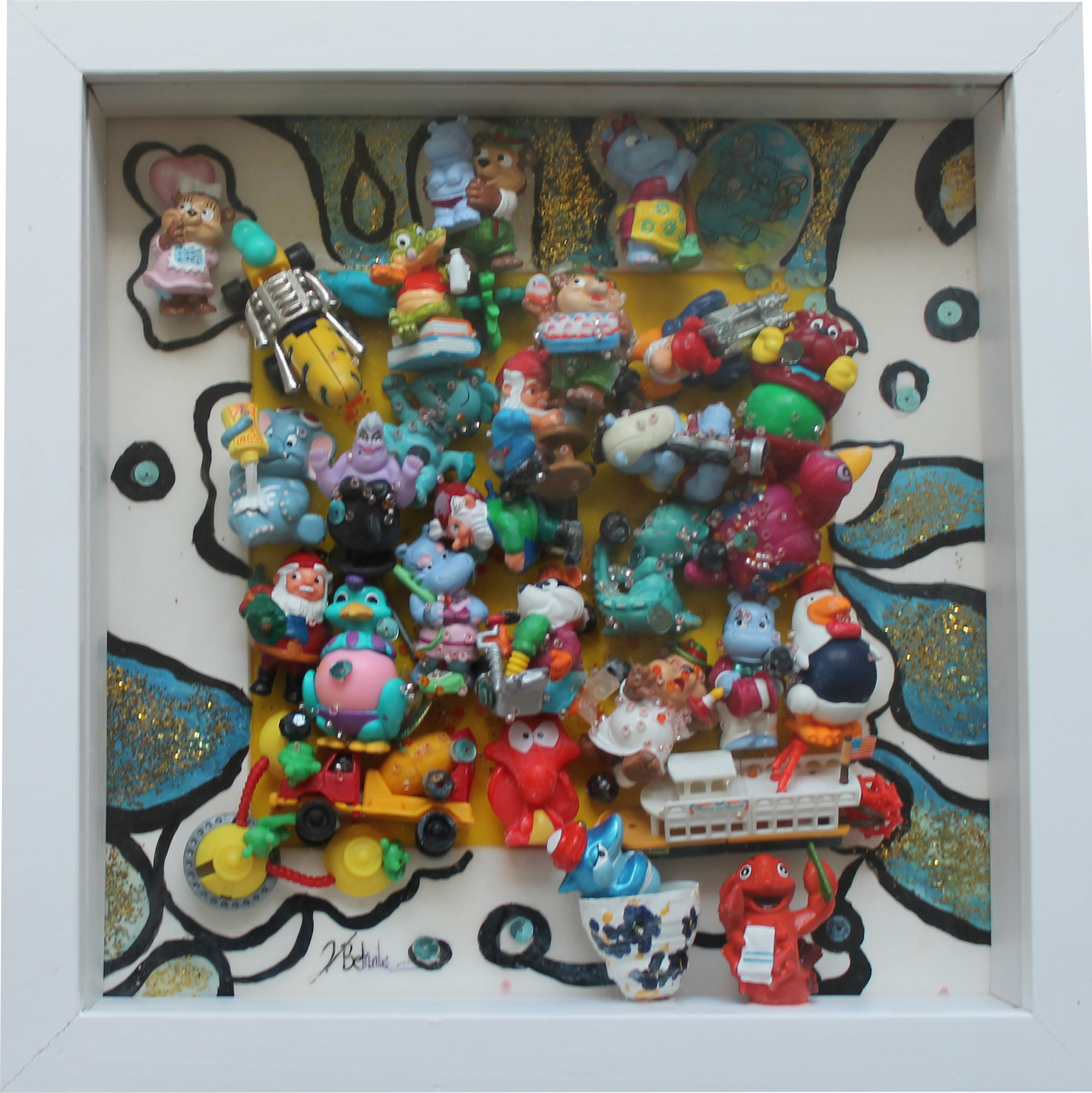 Ü-Eier und Acrylfarbe auf Karton. Ein Ü-Ei Potpourri als Komposition aus zusammengesetzten Kindheitserinnerungen. Verbunden in einem 3D Rahmen.