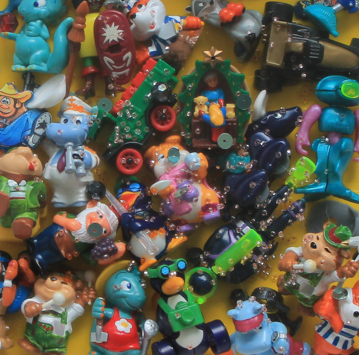 Ü-Eier und Acrylfarbe auf Karton. Ein Ü-Ei Potpourri als Komposition aus zusammengesetzten Kindheitserinnerungen. Verbunden in einem 3D Rahmen.