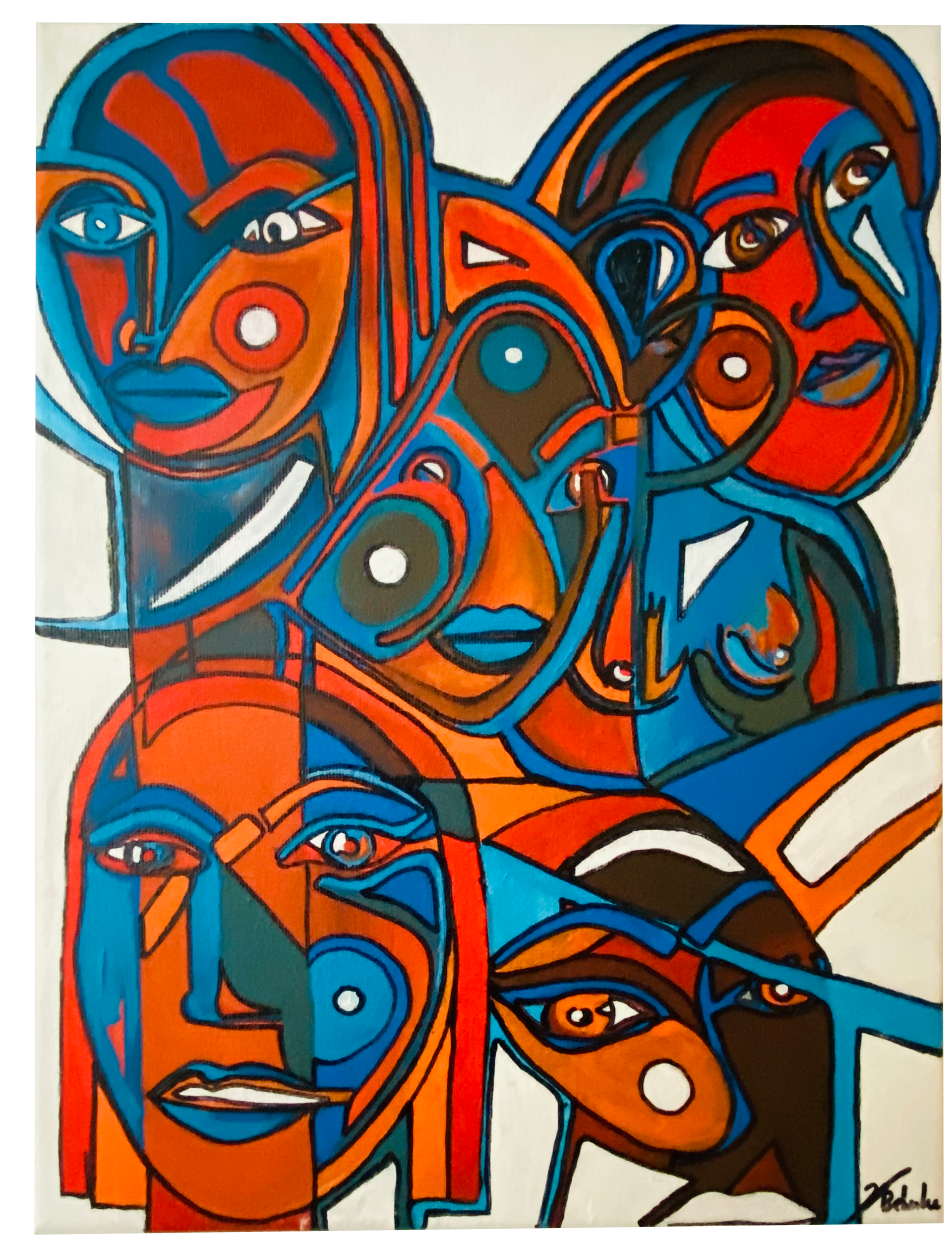 Unterschiedliche Persönlichkeiten in einem Bild vereint. Die Gesichter sind mit Acrylfarbe und Filzstift auf Leinwand gemalt.